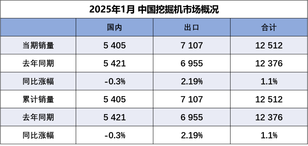 • 2025年1月挖掘機國內市場銷量5405臺,同比下降0.3%